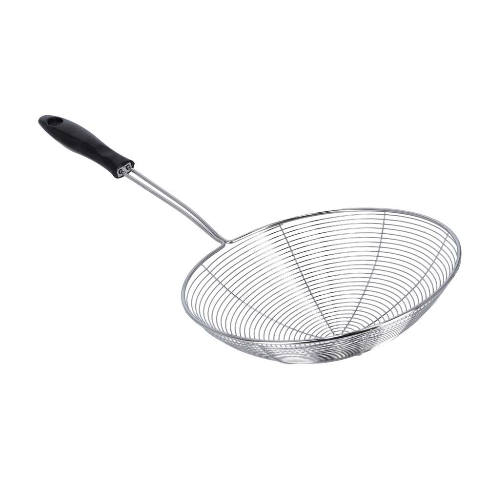 - WIRE STRAINER - The concave net catches food securely while releasing oil and other residues. Perfect for frying foods, like potato chips, chicken legs, and scoop up noodles, Spaetzle, Pasta, Spaghetti, and more.