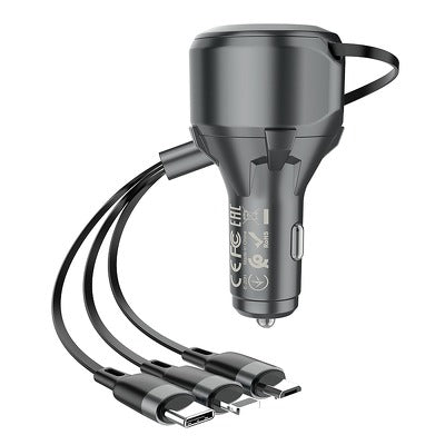 A car charger with a USB connector and a retractable cable with three tips. It allows for instant energy replenishment in three devices simultaneously.