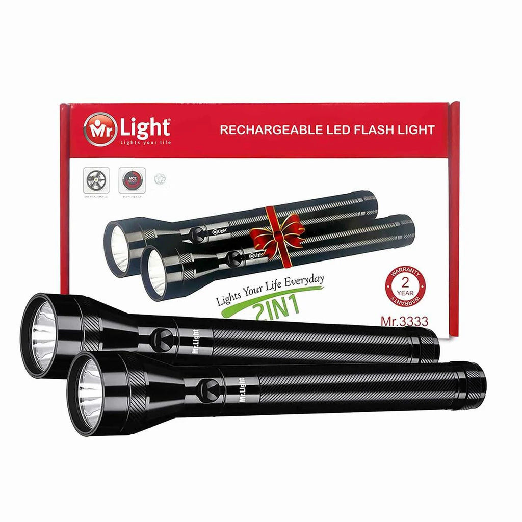 Stay prepared for any situation with the MR. Light Rechargeable LED Flashlights. This 2-pack set offers powerful illumination, long-lasting battery life, and a compact, portable design. Perfect for home, work, or outdoor adventures.
