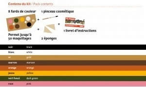 8 colours: 7 different face painting ideas: tiger, jaguar, zebra, giraffe, dinosaur, bear, camouflage.