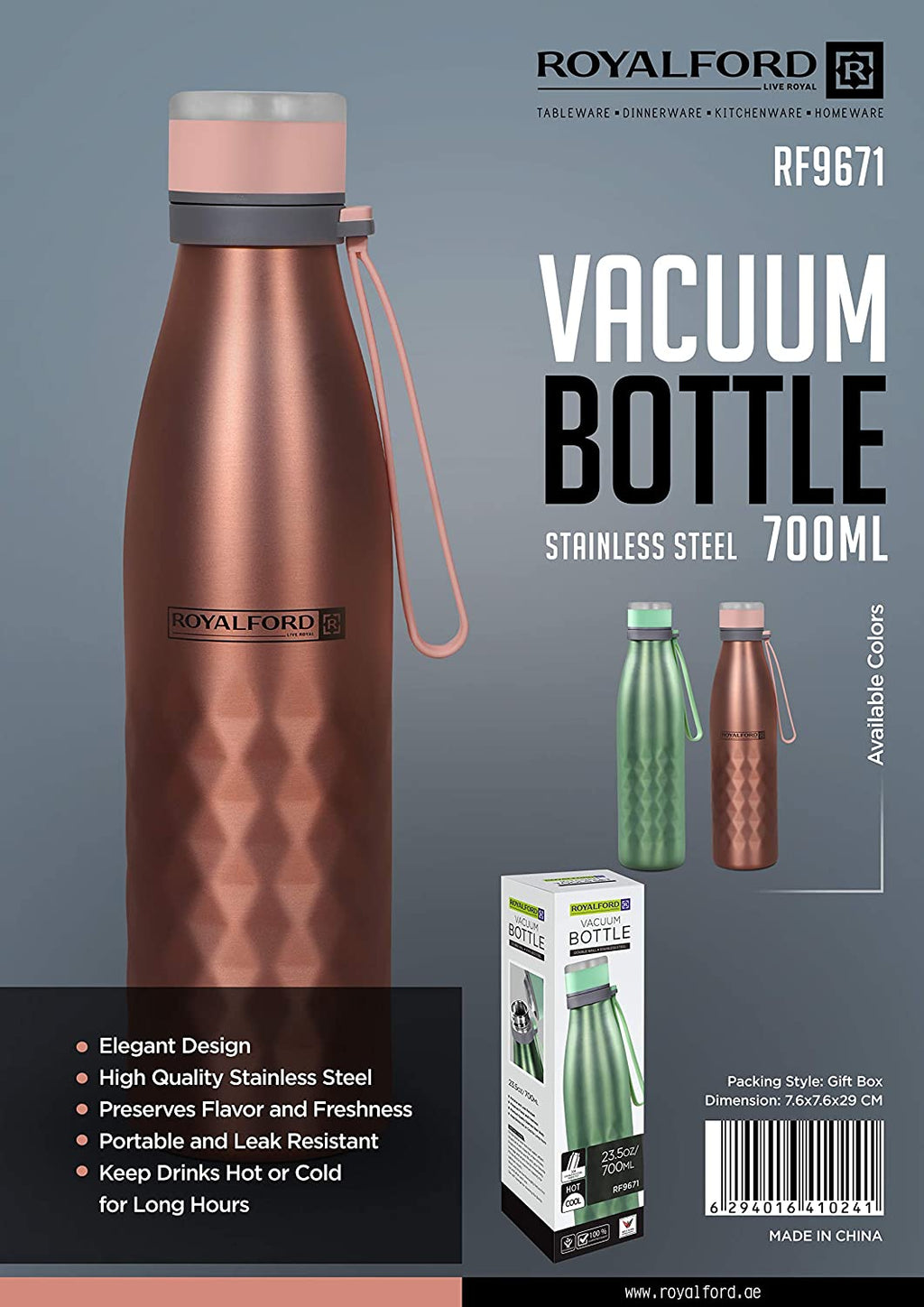 This Royalford Stainless Steel 700ml Water Bottle you're hard at work or playing hard, it helps to keep you hydrated! But more than that, it will help you stay motivated. We specially designed the bottle with lots of special features that make our bottles stand out from the competition.For instance, each bottle was designed to fit in most car cup holders, because we have personally experienced that feeling of annoyance when the bottle you are holding flies across the car as you turn a corner. Strong lifestyle bottles feature a soft carry loop, which was created after our team was frustrated by the rigid carry loops on other bottles that had sharp edges touch! Even more, we created fun, printed designs because you deserve a better bottle - not the same, plain, boring bottle that everyone else carries.