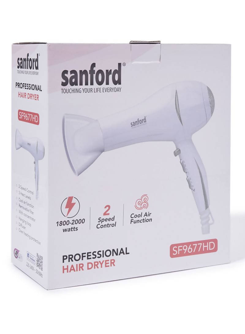 Sanford 1800 Watts Hair Dryer – White SF9677HD BS – The Sanford Hair Dryer is perfect tool to achieve your favorite style. It is quick and convenient way to dry your hair. The handle provides comfort grip and it features loop at the end for hanging. It features over heat protection, 2 heat levels and 3 speed controls.