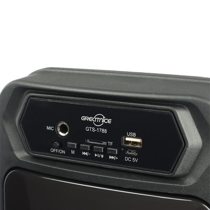 The GTS-1788 Speaker combines powerful audio performance with dynamic RGB lighting, perfect for creating a lively atmosphere. This speaker features a 5W x2 speaker system and a range of connectivity options, including USB input, SD card slot, and FM radio. Its rechargeable battery ensures portability, while the included V8 charging cable makes recharging easy.