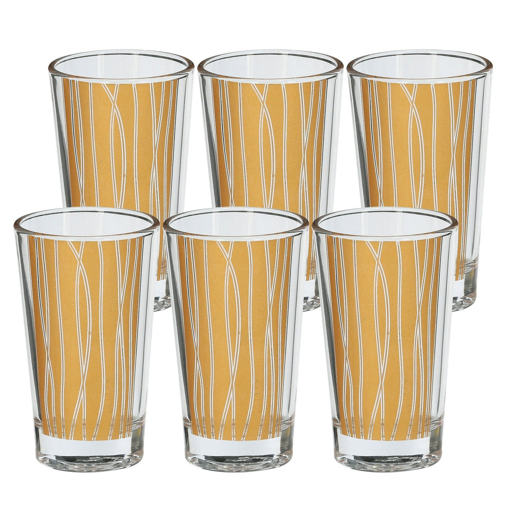 Your guests will be impressed when you serve them tea in this simple and elegant gold Royalford RF7931 Glass Lana Royal Tea Set. Crafted from high-grade glass, this 6-piece tea set not only has a premium look but also a robust build and base. The classic tumbler-style design of these glasses is quite appealing, and it is sure to complement your other tableware.