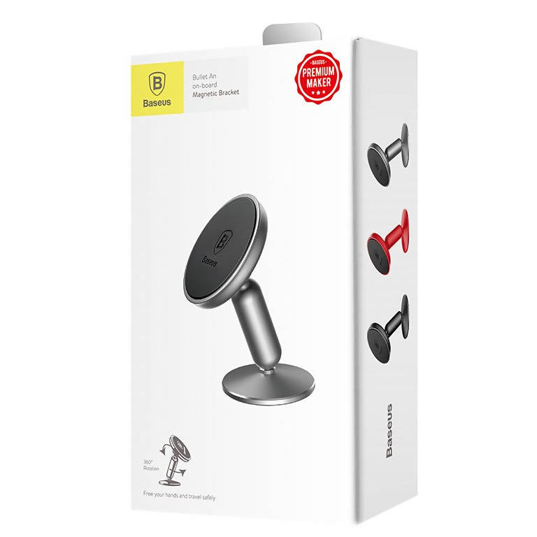 Baseus Bullet An On-board is an amazing car mount with stylish metal texture and powerful magnetic force. Made of premium quality aluminum, durable accessory with beautiful circular arc appearance, precisely cut and polished by CNC. All that provides comfortable and smooth hand feeling. Thanks to 4 Rb magnets (well-known as “Magnet King”) powerful magnetic forces can draw your phone tightly on the complex road. Also, them not affect the phone signal. The bracket has 360 universal rotation and 3M glue strong adsorption. It?s easy to operate with only one hand.