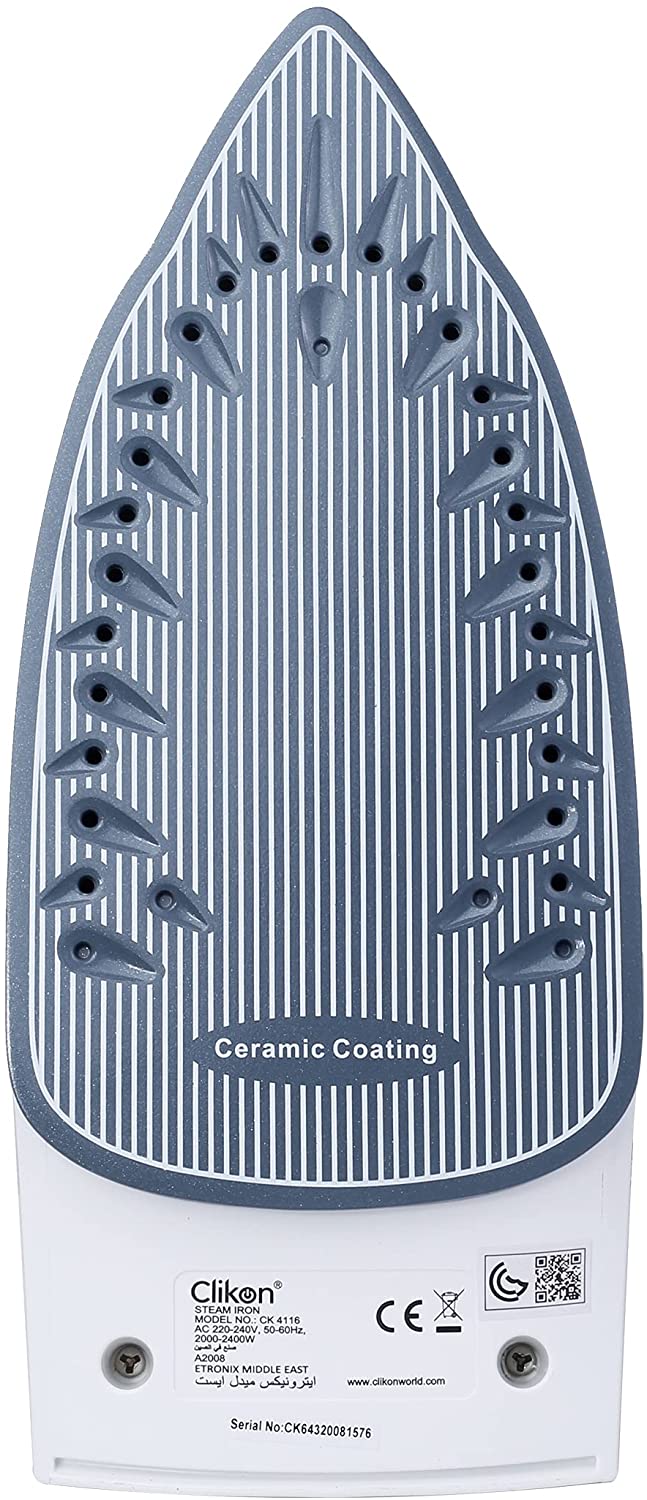 Steam iron Dry, Steam, Spray, Burst and Vertical steam functions Ceramic Non-Stick soleplate Self Cleaning function Heating Indicator Light Adjustable temperature for all fabrics AC 220-240V, 50/60Hz, 2000-2400W