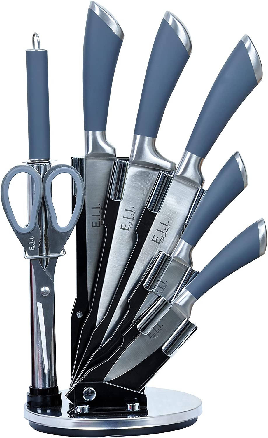 Set Contents: Chef knife, Bread Knife, Santoku Knife, Multipurpose Knife, Paring Knife, Scissors 18cm, Sharpener.