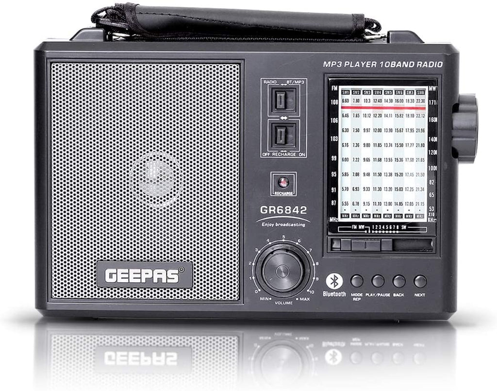 FM Radio Strong FM reception, search and save the most available stations in your area. Supports manually control stations with the rotary know given. Bluetooth Speaker Thanks to its unique enhanced sound quality, you can enjoy music in best way possible. Easily connected to your phone / tablet or any other Bluetooth-enabled devices, also automatically reconnects to the last connected device. Easy to Use Power on the radio and ready to go, tune to your favorite stations, adjust to your desire volume, have a good rest! No complicate technical things. Great choices for senior, elder person as well as ideal gift for parents! Portable Design Just carry it to anywhere due to its portable carrying handle. Its comfortable handle and outer case are made of high-quality material that can protect the radio better. Music on the move This great little portable radio is powered by Built-in in high capacity lead-acid rechargeable battery. Plus, the handy carry handle makes it even easier to carry around with you.