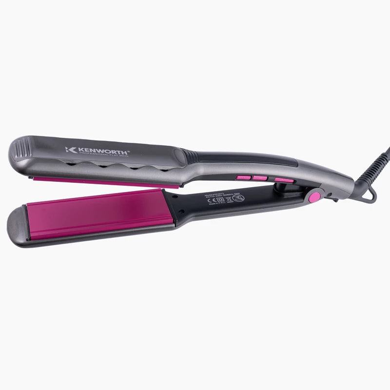 The Kenworth KW3073 Hair Straightener combines innovative design with advanced technology to deliver exceptional styling results. Featuring ceramic plates, it ensures even heat distribution and prevents hair burns. With a high heat capacity and PTC heating technology, this straightener maintains its temperature effectively. It heats up in just 30 seconds and offers adjustable temperature settings up to 950°F, displayed on an easy-to-read LED screen. For added safety, it includes an automatic shut-off feature that activates after 60 minutes of inactivity. The 360-degree rotating cord enhances maneuverability, making it perfect for both straightening and styling.