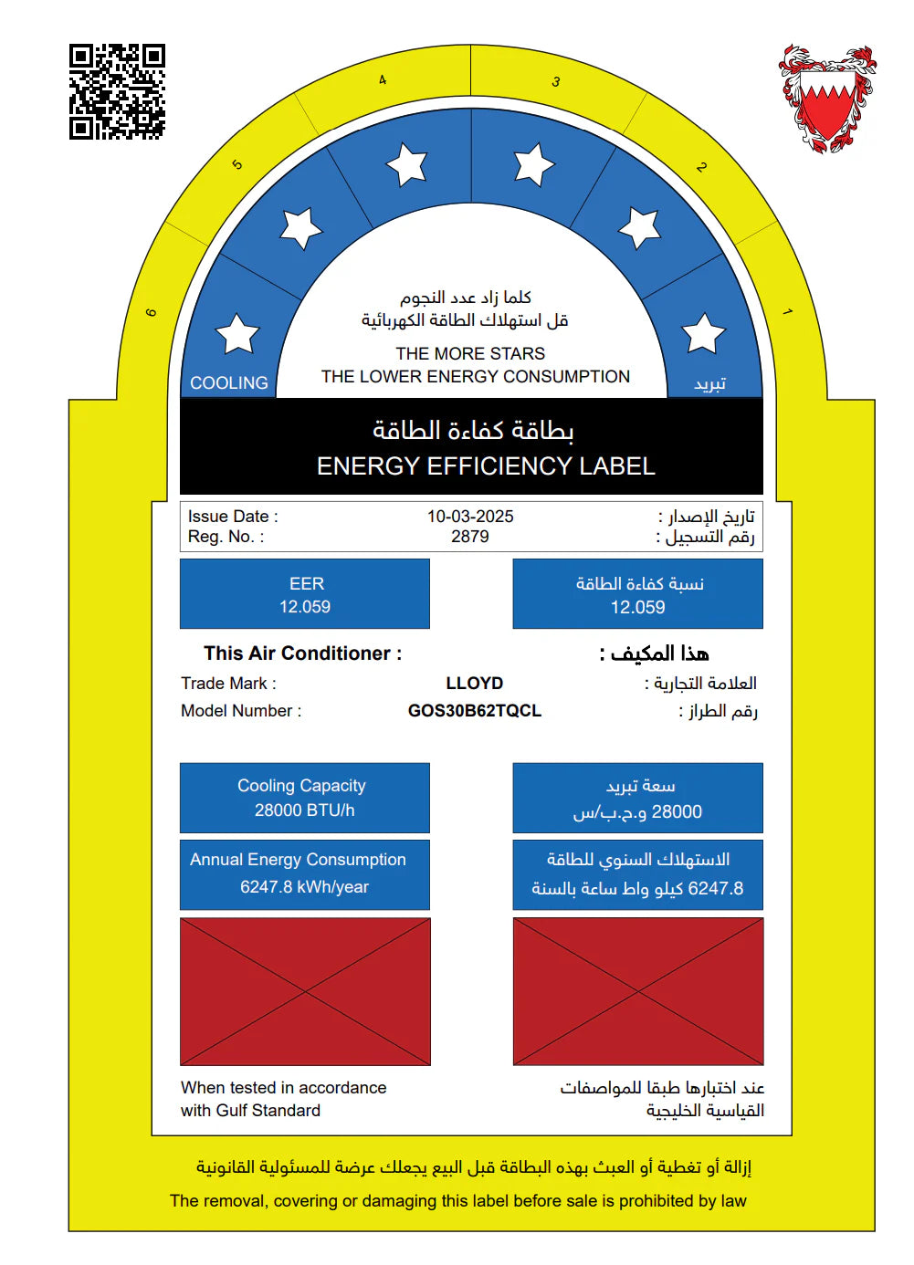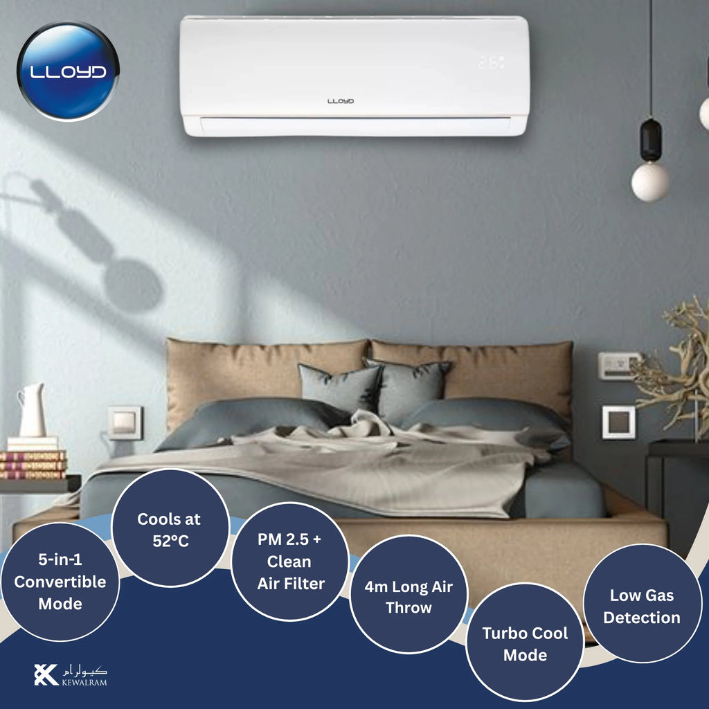 Lloyd 2.5 Tons Split AC, GOS30B62TQCL Capacity: 2.5 tons (28,000 BTU/h), ideal for rooms up to 250.