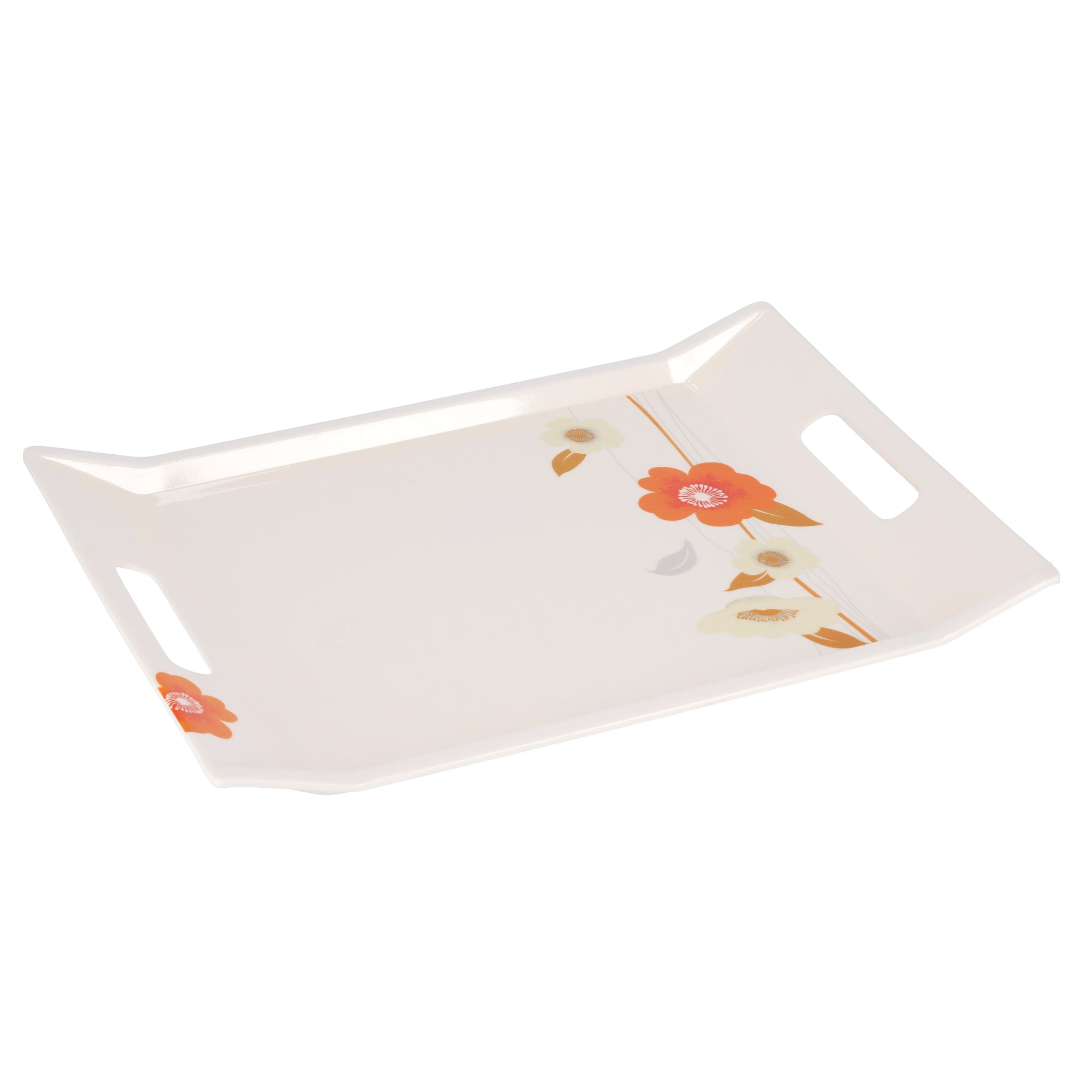 Impress your guests by serving them tea on this elegantly designed Royalford RF7254 Melamine Tray. Crafted from high-quality melamine, this robust tray will last you several years. Moreover, its two handles on each side are raised, ensuring a firm and comfortable grip. There is plenty of room on this melamine tray for multiple cups of tea, as it measures 38.5 x 27.3 x 1.6cm. The sturdy design coupled with the attractive floral motifs on this Royalford melamine tray makes it a must-have in your home.