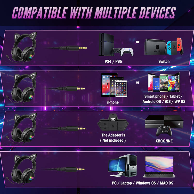 ONIKUMA X11 Cat Ear Headset 3.5mm Jack 50mm Sound Unit RGB Light Gaming Headphone Detachable Noise-canceling Mic for PS4 Computer PC Gamer - Black.