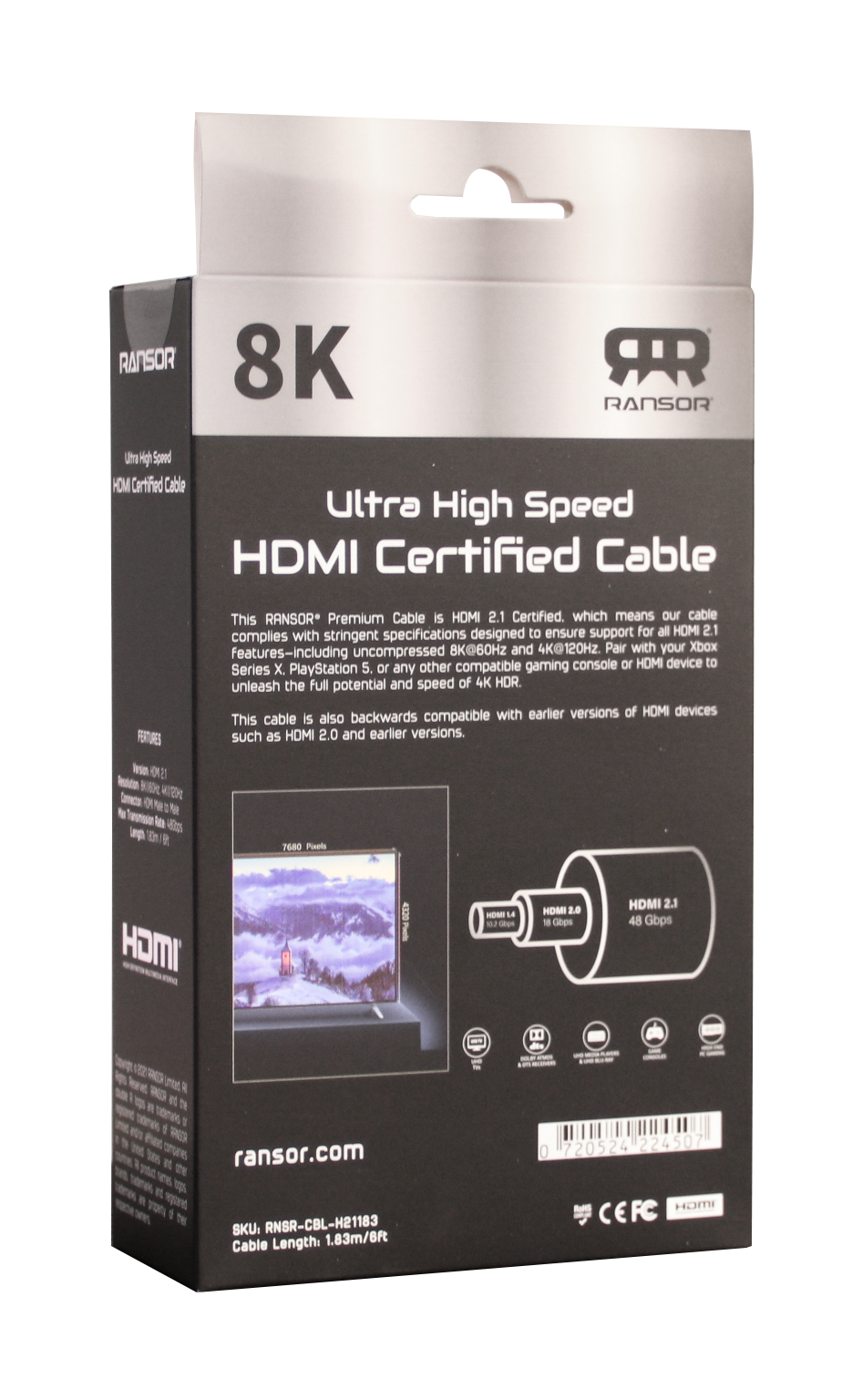 This RANSOR® Premium Cable is HDMI 2.1 Certified. Which means our cable complies with stringent specifications designed to ensure support for all HDMI 2.1 Features—including uncompressed 8K@60Hz and 4K@120Hz Pair with your Xbox Series X. PlayStation 5 or any other compatible gaming console or HDMI device to unleash the full potential and speed of 4K HDR.