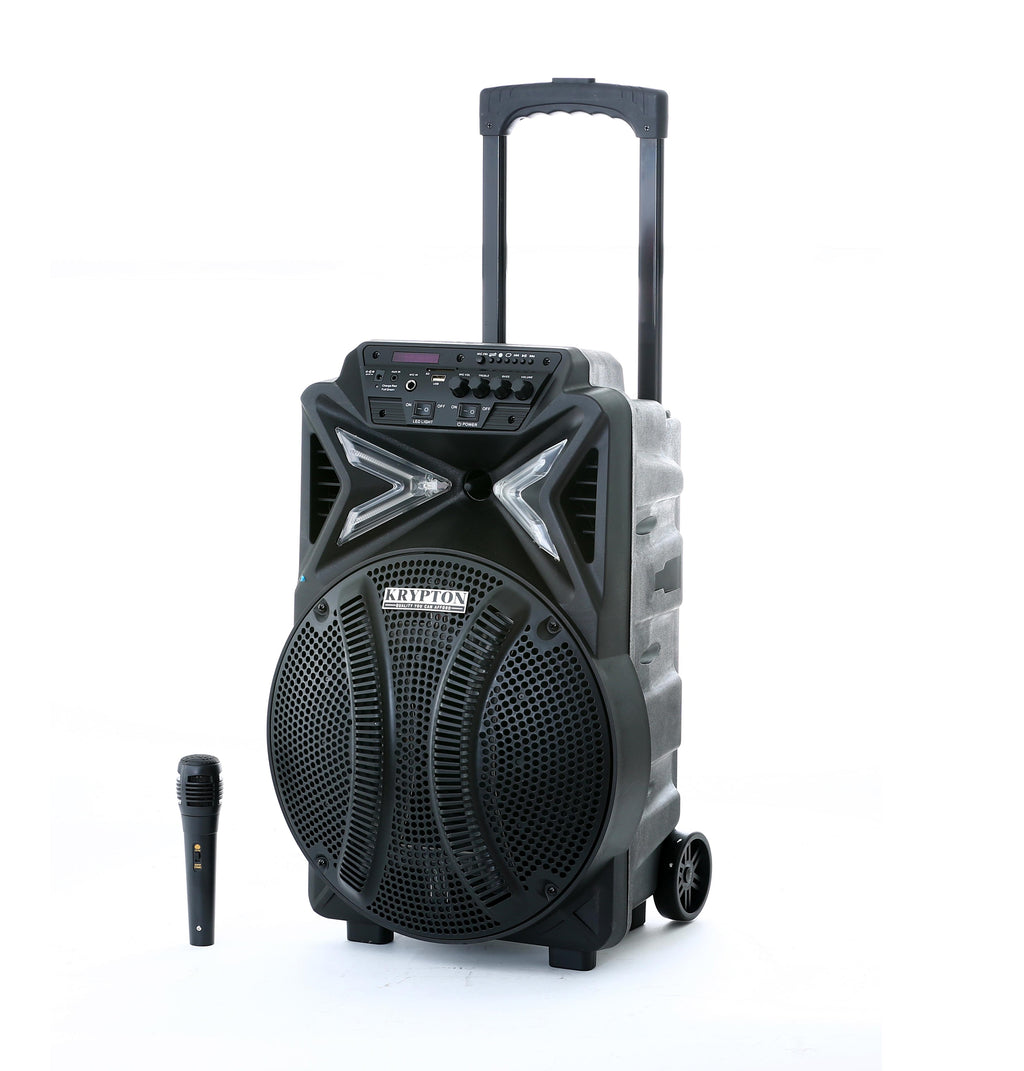 Krypton Portable Rechargeable Trolley Speaker - This speaker is ideal for parties and large gatherings or large spaces. The Impedance: 40 ohm Output with extra bass will blow you away. The wireless Mic can be used to sing along with music or make announcements. Additionally this speaker also has the extra features of a USB port through which you can play your music by connecting a Pen Drive, an Aux in slot to connect various other media devices, SD card reader with audio Playback & FM radio. The speaker has an inbuilt rechargeable battery. It can be used for outdoor activities, advertising campaigns and recreational activities. It is designed with innovation and is decorated with Ball stage lights on the top and LED lights woofer to set up the mood for a celebration. A perfect combination for a party.
