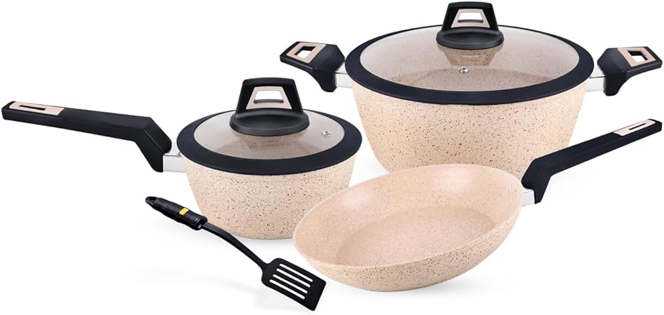 Royalford 6 PC Granite coated cookware Set with Glass Lid, 1Pc Saucepan with Lid, and 1 PC Frying Pan.and 1pc cooking pot .