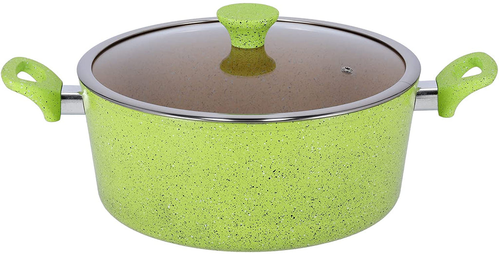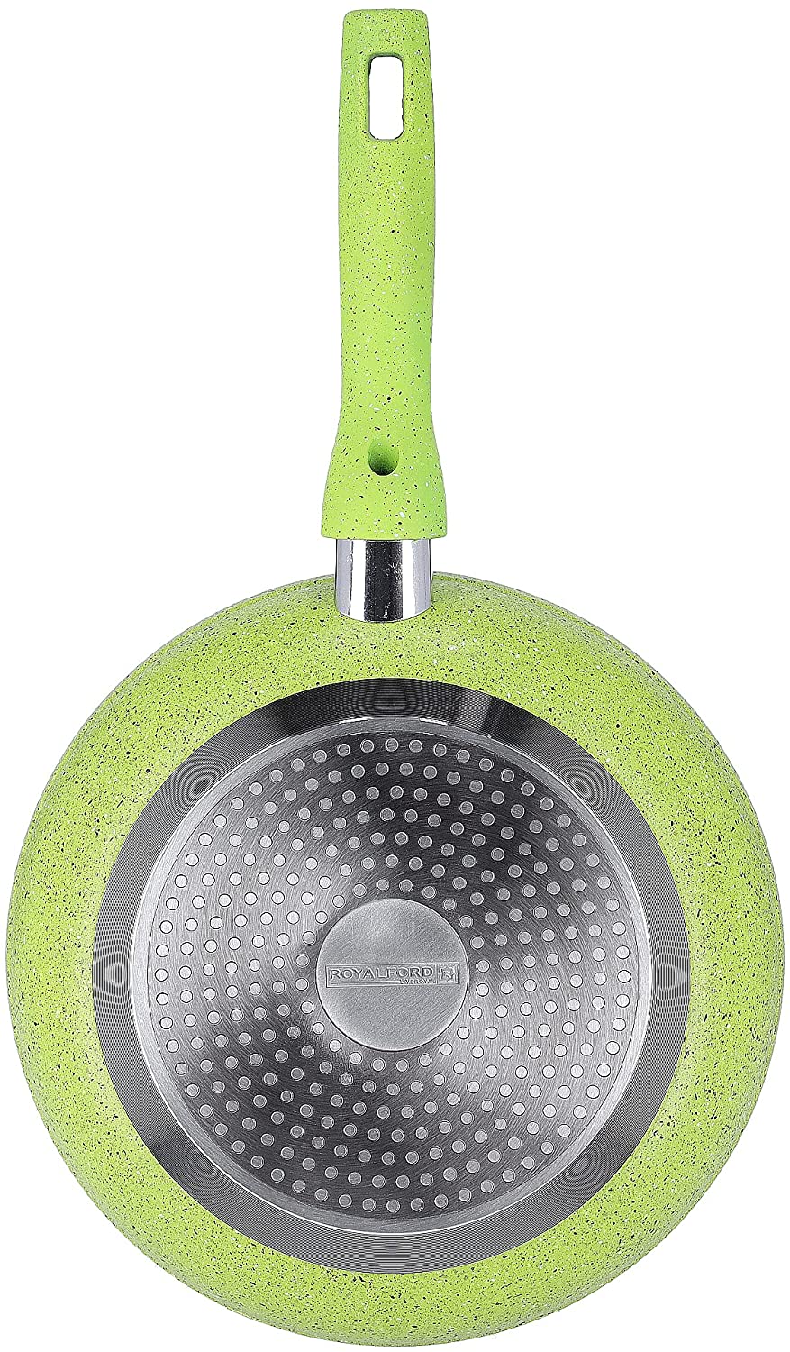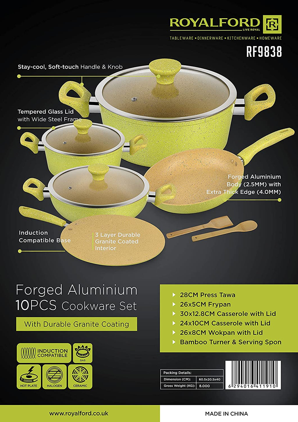NON-STICK COATING AND COMPACT LID - The Royalford 10 Piece Cookware Set has a 3-ply granite coating and has a sturdy glass lid with handles where it is easy to lift up to view in a casserole to check while the dish is being cooked. Solid anodized aluminum cookware is easy to clean with a granite-coated surface with gentle water washing.