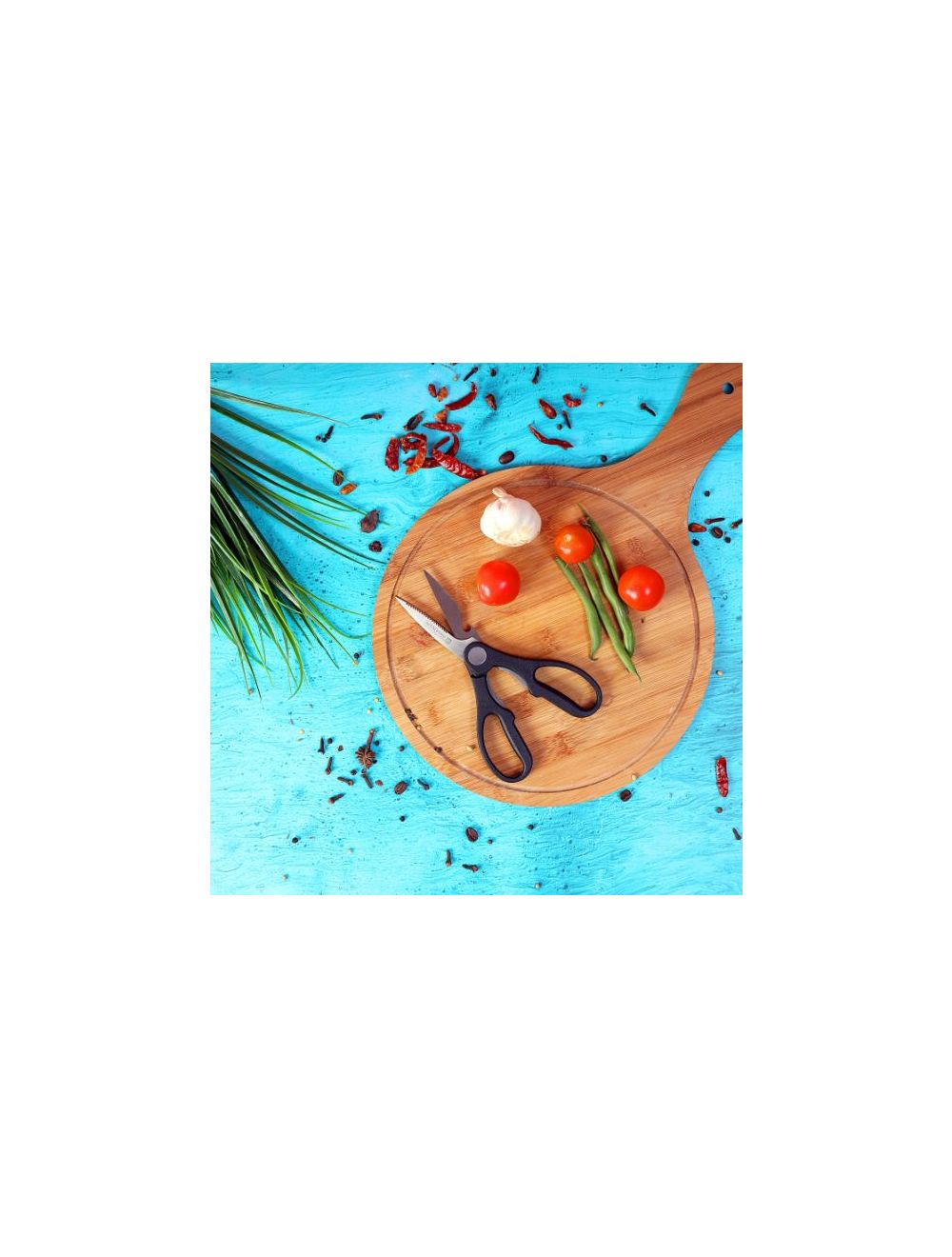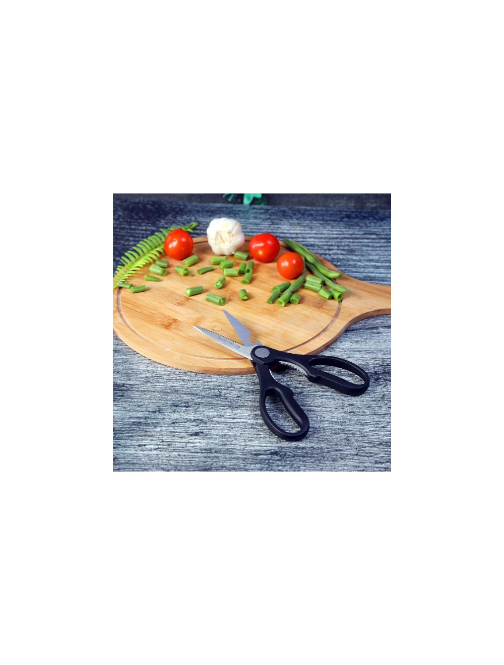 REMARKABLE PERFORMANCE - The kitchen scissor has micro-serrated blade edges that provide non-slip cutting for various different kitchen tasks specially scraping fish scales. High-grade rivets make the shear more durable. A serrated section on the blades for opening tough sealed bottles and jars. Can also crack nuts and shells using the serrated section on the inside of the handles! The sleek black handles will become your favourite kitchen utensil. Can be used for both home and professional use