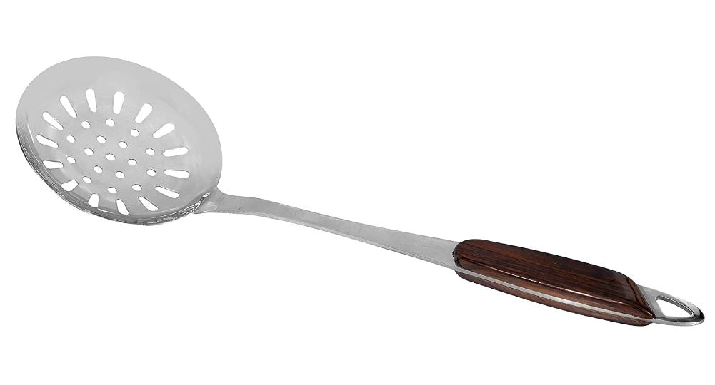 • WOODEN FINISH HANDLE - Ladle for hanging storage with the loop in handle. It can be hung on the wall after use, to keep dry and clean. Easy to store and easy to quickly grab this skimmer, this also looks great reflecting in the light while hanging in your kitchen.