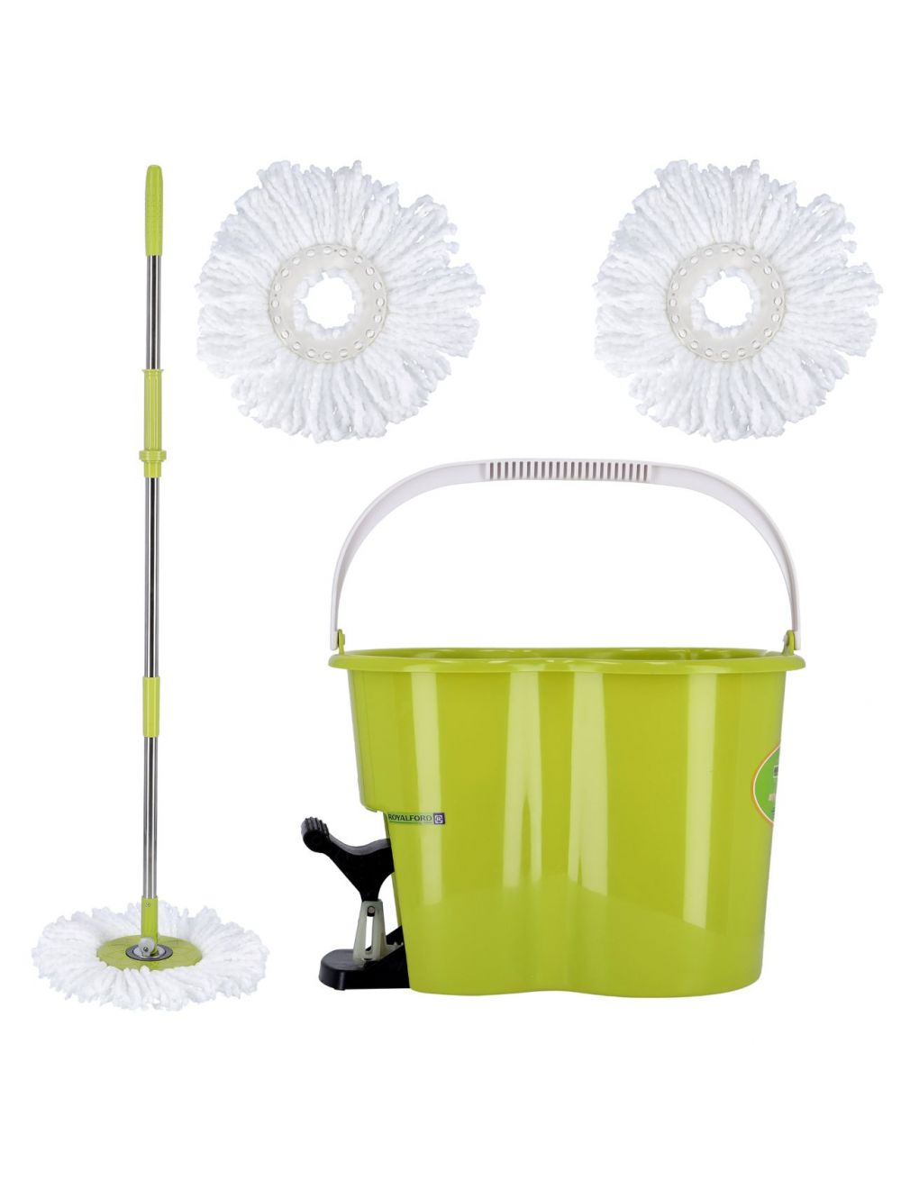 - Simply rinse the mop head in the bucket and place into the wringer whilst holding the handle loosely. Press the foot pedal to spin the wringer and there you have it! the mop head has a triangle shape for improved corner cleaning, and the bucket includes a fill-level indicator to prevent overfilling.