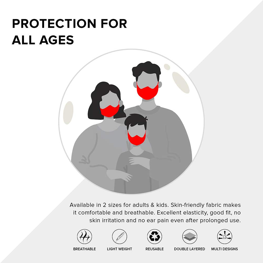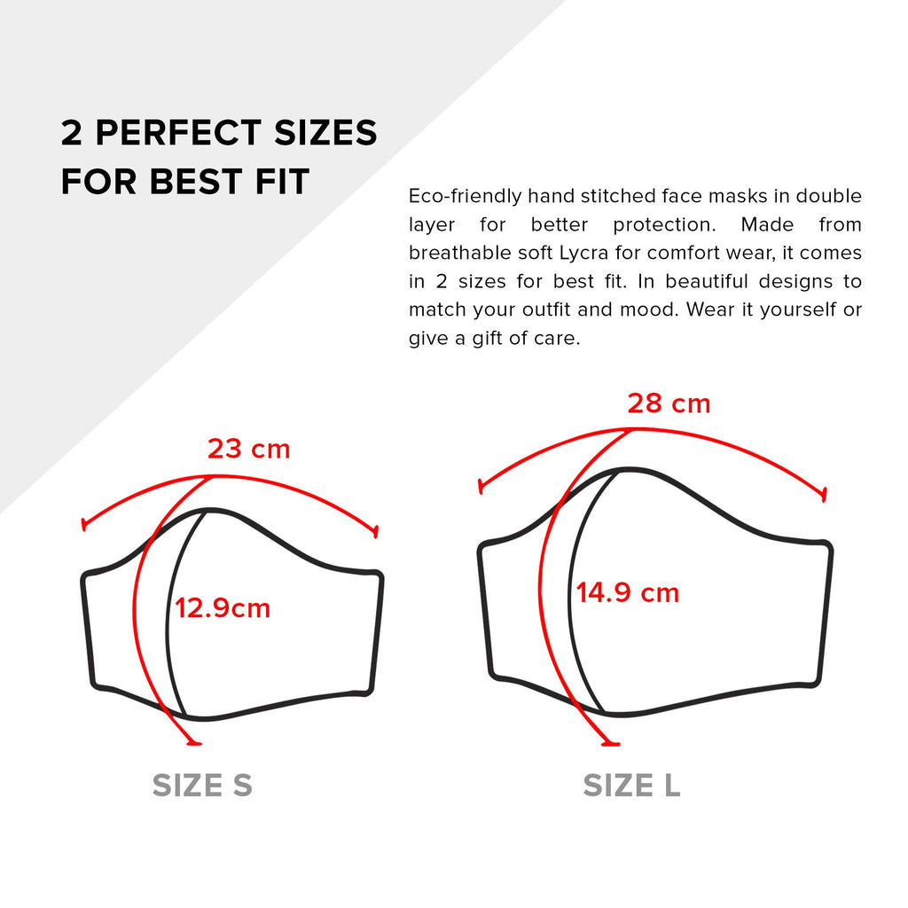 Features Comes in 2 Sizes - Large (14.9 x 28 cm) & Small (12.9 x 23 cm) Comfortable & soft Lycra microfibre Contour form fitting design High quality vibrant prints Breathable stretch material Moisture wicking quick dry cloth Adjustable ear loops Note: The screen designs/artworks are intended as a guide only and should not be regarded as absolute final. All colors, size and alignment you see on your monitors are approximations of final output and could vary slightly on actual product. Disclaimer These are not PPE or medical grade. They may reduce transmission of airborne droplets which may contain germs, bacteria or virus. Users should adhere to government, public health advice and social distancing measures at all times. Stay safe, protect others.